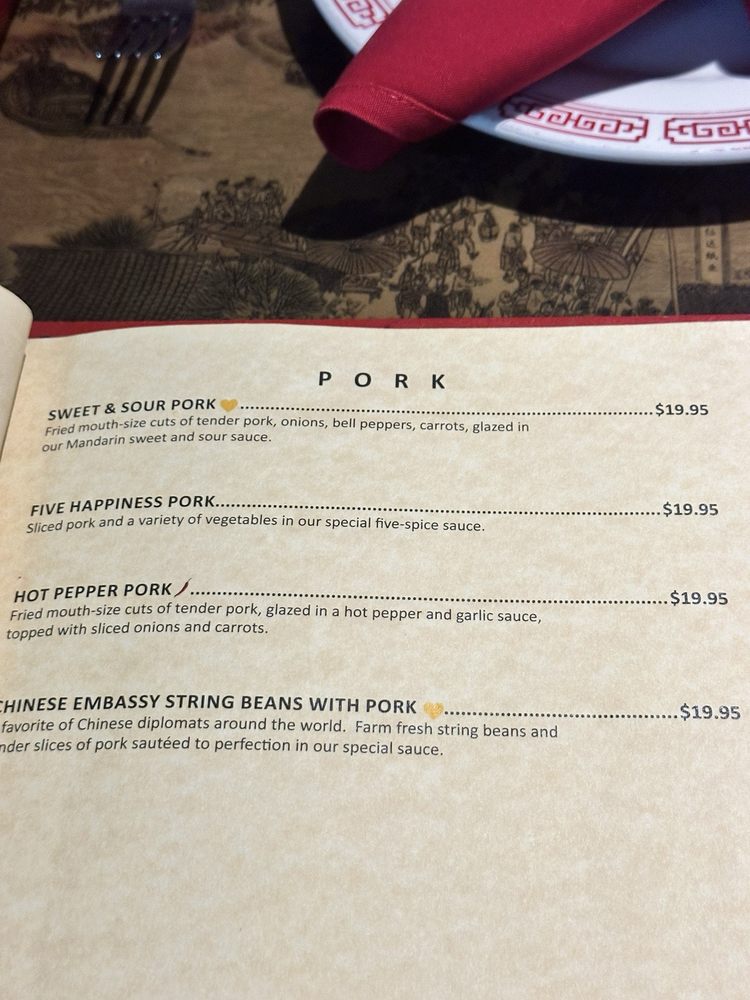 A favorite of Chinese diplomats around the world. Farm fresh string beans and tender slices of pork sautéed to perfection in our special sauce.