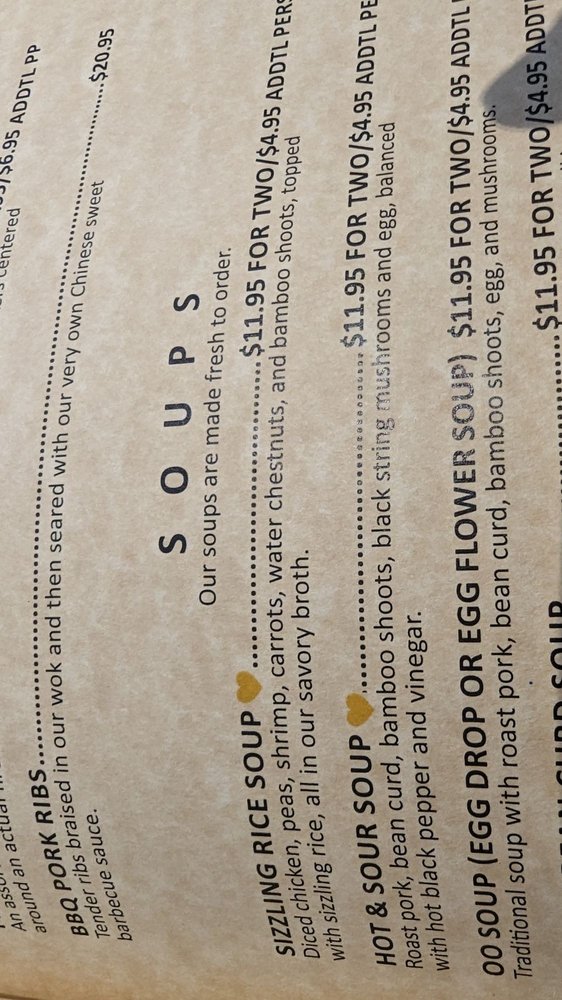 Diced chicken, peas, shrimp, carrots, water chestnuts, and bamboo shoots, topped with sizzling rice, all in our savory broth.