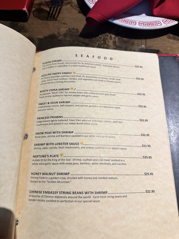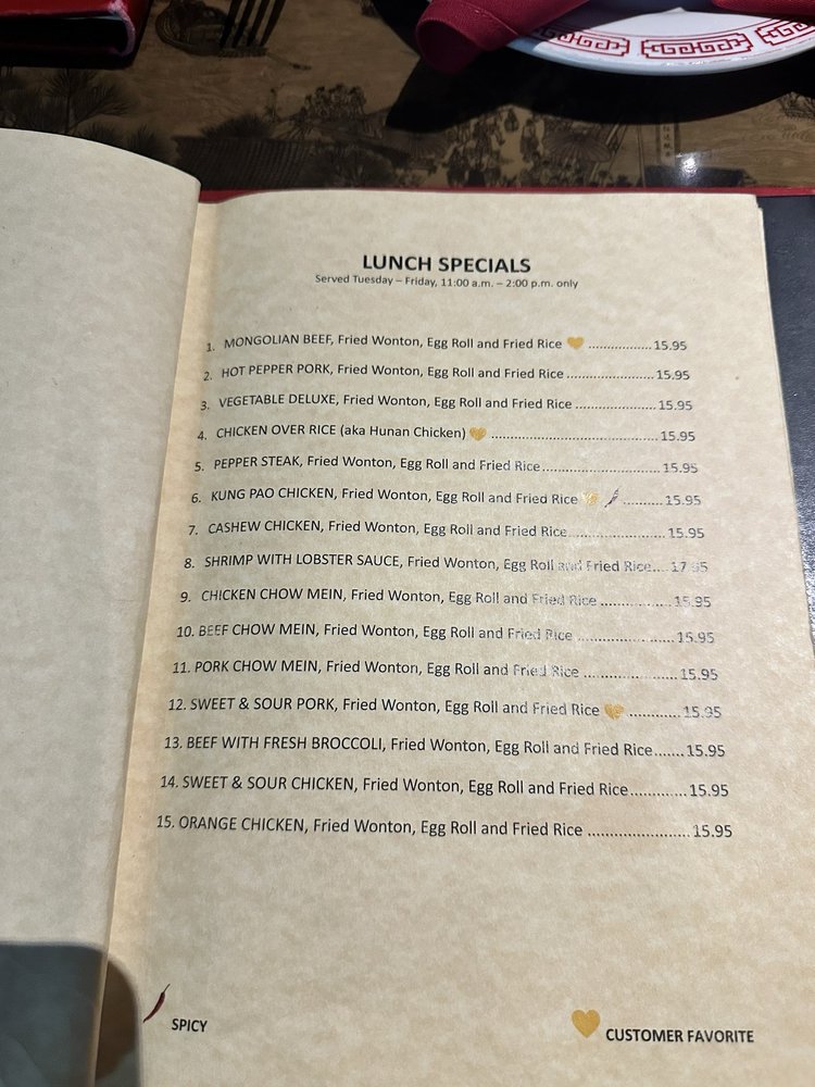 Sizzling rice soup, pot stickers, mongolian beef, sweet & sour pork, garlic chicken, north china vegetable deluxe, north china shrimp, beef with fresh broccoli, phoenix dragon, sizzling happy family, steamed rice.