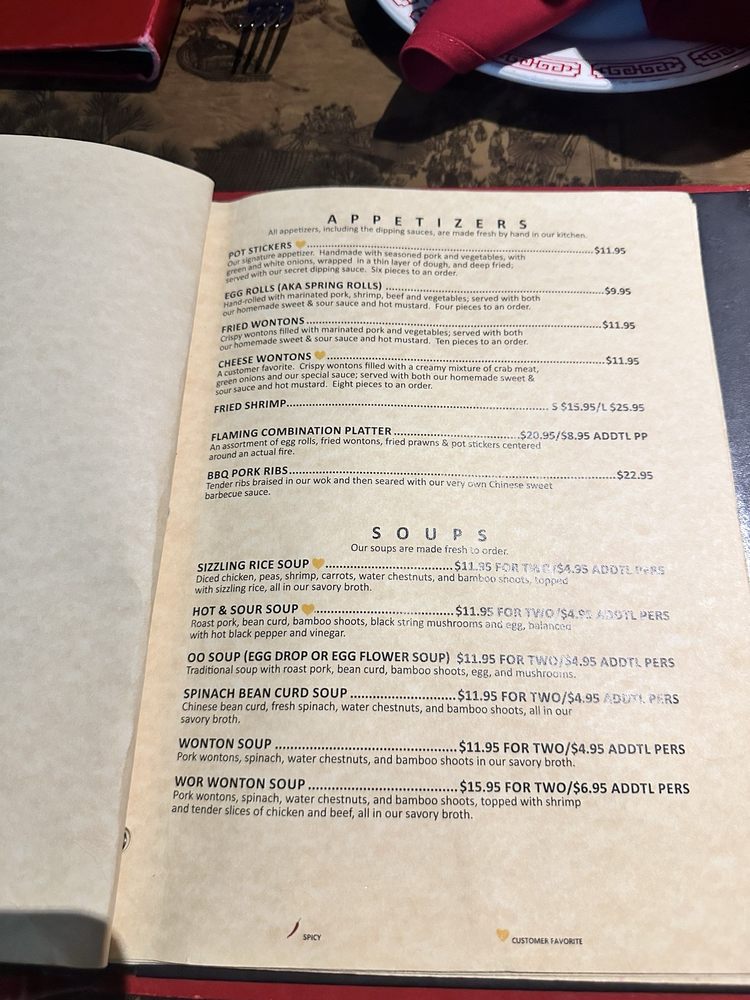 Sizzling rice soup, pot stickers, mongolian beef, sweet & sour pork, steamed rice.