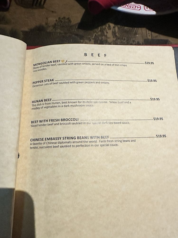 A favorite of Chinese diplomats around the world. Farm fresh string beans and tender, succulent beef sautéed to perfection in our special sauce.